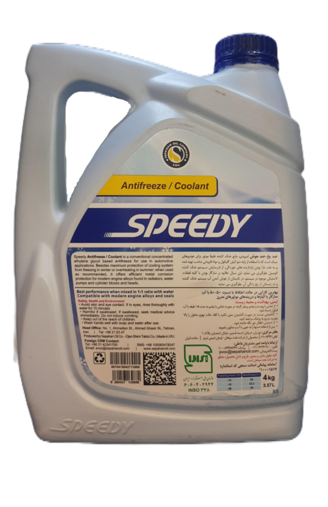 - سازگاری با موتورهای مختلف: ضد یخ اسپیدی با انواع موتورهای بنزینی و دیزلی سازگار است و هیچ گونه مشکلی برای سیستمهای خنککننده به وجود نمیآورد.